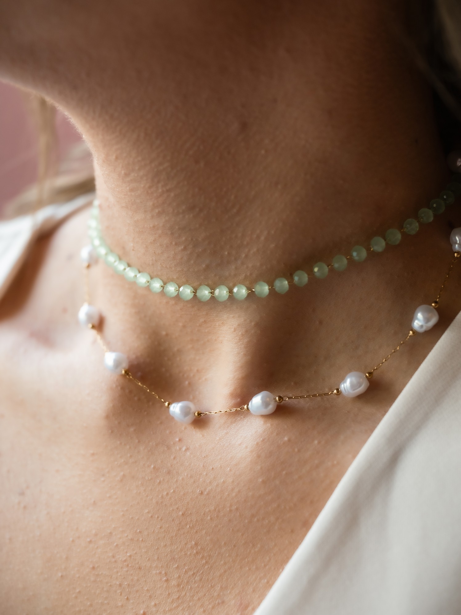 Δροσερό και ρομαντικό με ημιδιάφανες, ανοιχτοπράσινες χάντρες που αποπνέουν φρεσκάδα και νεανικότητα. Ενώ στο κάτω μέρος φυσικές λευκές πέρλες, αραιά τοποθετημένες σε λεπτή χρυσή αλυσίδα.