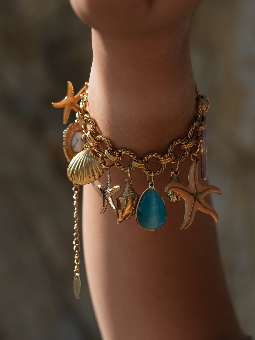 Χειροποίητο βραχιόλι σε χρυσή απόχρωση, διακοσμημένο με ατσάλινα στοιχεία εμπνευσμένα από τη θάλασσα: αστερίες, κοχύλια και σταγόνες. Οι χρωματιστές ημιπολύτιμες πέτρες προσθέτουν ζωντάνια και καλοκαιρινή ενέργεια, ενώ η στιβαρή αλυσίδα προσφέρει άνετη εφαρμογή και διάρκεια στον χρόνο.