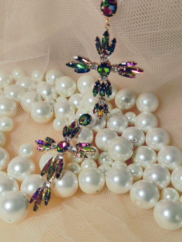 Σκουλαρίκια σε σχέδιο σταυρού με ιριδίζουσες πέτρες που αλλάζουν χρώμα, χαρίζοντας μια αύρα μυσταγωγικής πολυτέλειας