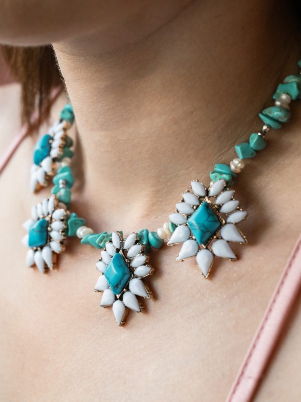 Ένα εκθαμβωτικό statement κολιέ που μαγνητίζει το βλέμμα τον boho και tribal χαρακτήρα του. Αποτελείται από ακανόνιστες τιρκουάζ ημιπολύτιμες πέτρες με κυριαρχία από τα εντυπωσιακά κεντρικά μοτίβα